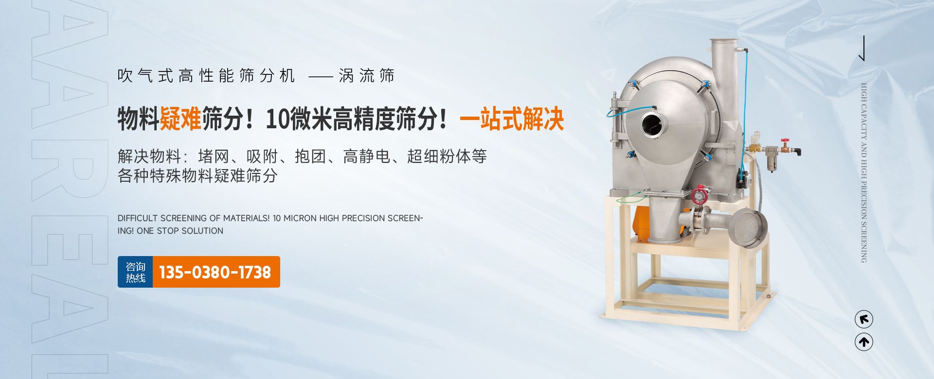 阿 瑞 爾(AAREAL)? 是從事篩分·過濾設備設計和制造的高新技術企業(yè),擁有先進的生產設備、粉體篩分分析實驗室,在中國廣州市設辦事處。祝賀:新鄉(xiāng)市超大產能精細篩分技術工程中心在阿瑞爾(AAREAL)成立!!!在線大產能篩分和在線動態(tài)過濾是阿 瑞 爾(AAREAL)?的產品特點■ 在線大產能篩分,突破了傳統(tǒng)篩分觀念,工業(yè)化篩分,實現(xiàn)大產能、高能效篩分。以低故障率、低停機率、低使用成本、高產能、高精度、高能效為您帶來巨大意外收益。■ 阿瑞爾(AAREAL)擁有的回轉篩分技術,擁有的近百種篩分解決方案及上千種物料的篩分經驗,會給您展現(xiàn)全新的篩分設備,幫您實現(xiàn)大產能篩分 高精度篩分 疑難篩分。■ 阿瑞爾(AAREAL)的品質保證:阿 瑞 爾(AAREAL)? 是高品質篩分設備制造商高品質是阿 瑞 爾(AAREAL)? 質量準則。優(yōu)品設備 合理篩分是阿 瑞 爾(AAREAL)?回報客戶的驗收標準。——我們不但擁有先進的生產設備,而且對于每一道工序,每一個細節(jié),我們都要精工細作。對于客戶的每一個細微的問題,我們都要認真解決。——精心制作和用心服務是我們對客戶的責任。阿瑞爾(AAREAL)是您成功道路上值得信賴的、合作伙伴,以良好的質量、經驗和服務享譽多個國家,確保您安心地選擇每一件產品,阿瑞爾(AAREAL)竭誠與國內外商家雙贏合作,共同發(fā)展,共創(chuàng)輝煌!阿瑞爾(AAREAL)——您正確的選擇。